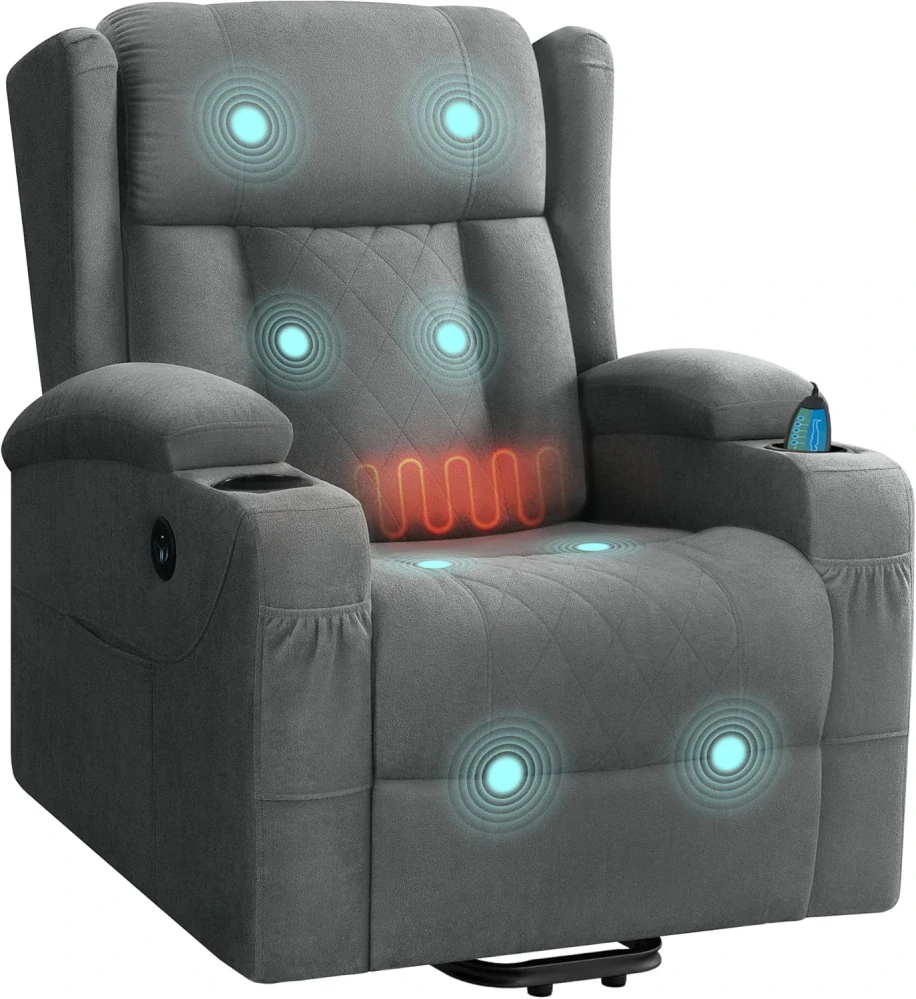 Elektrické polohovací křeslo WOLTU, masážní relaxační křeslo s asistencí zvedání, s masážním vyhříváním, opěrkou nohou, kapsami, držákem na nápoje, USB portem, froté, šedá, SKS61gr