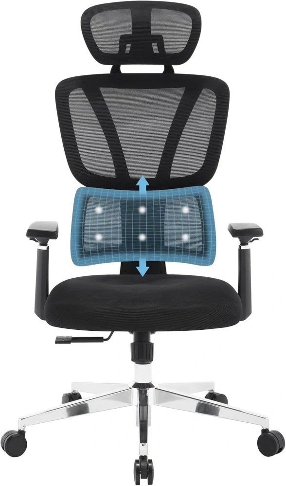 Kancelářská židle WOLTU, ergonomická otočná židle, nastavitelná výška, opěrka hlavy, bederní opěrka, 3D područky, houpací síťovina, 150 kg, černá, BS162sz