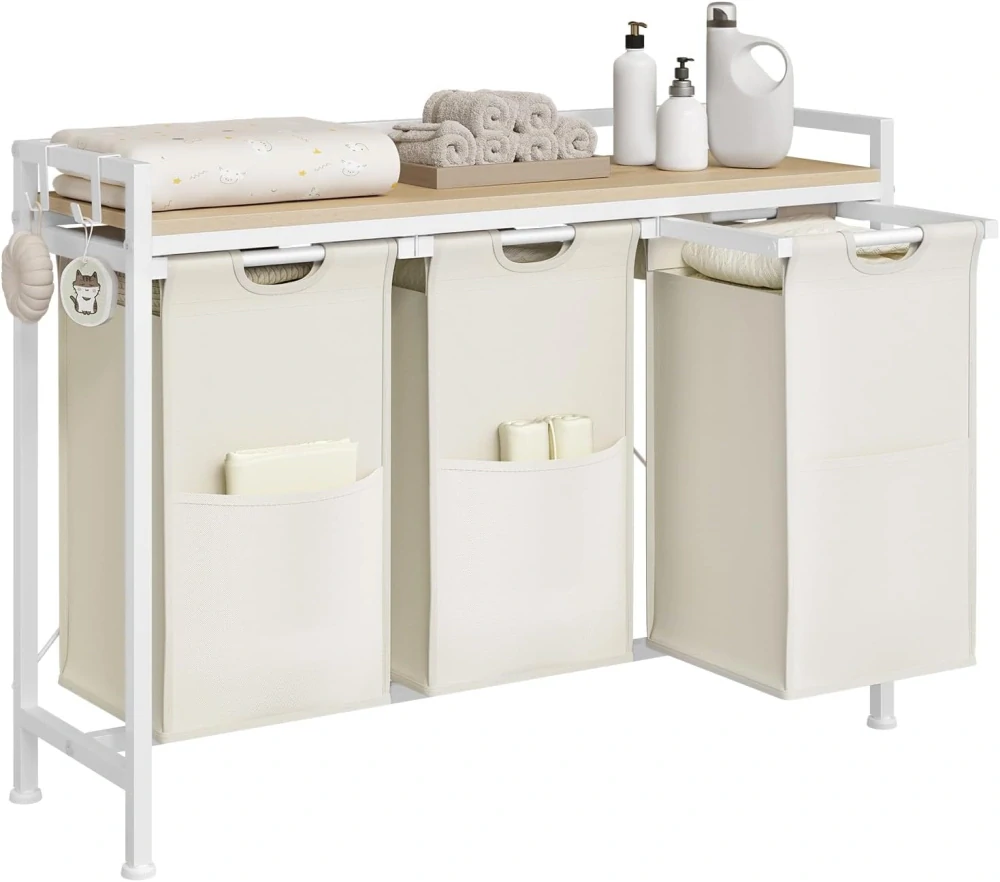 - MULTIFUNKČNÍ KOŠ NA PRÁDLO: Tento koš na prádlo má tři přihrádky o objemu 40 litrů s kapsami, ideální pro špinavé prádlo a ložní prádlo. Police na pracovní desce s nosností 15 kg je ideální pro prací prostředky, toaletní potřeby a další. Ručníky nebo osušky lze zavěsit na dva háčky, každý s maximální nosností 2 kg.