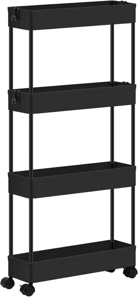 Servírovací vozík Klihome, 4 patra, úzký kuchyňský vozík s kolečky, výklenek s dutými košíky, pojízdná police do kuchyně, obývací pokoj, koupelna, plast, černá
