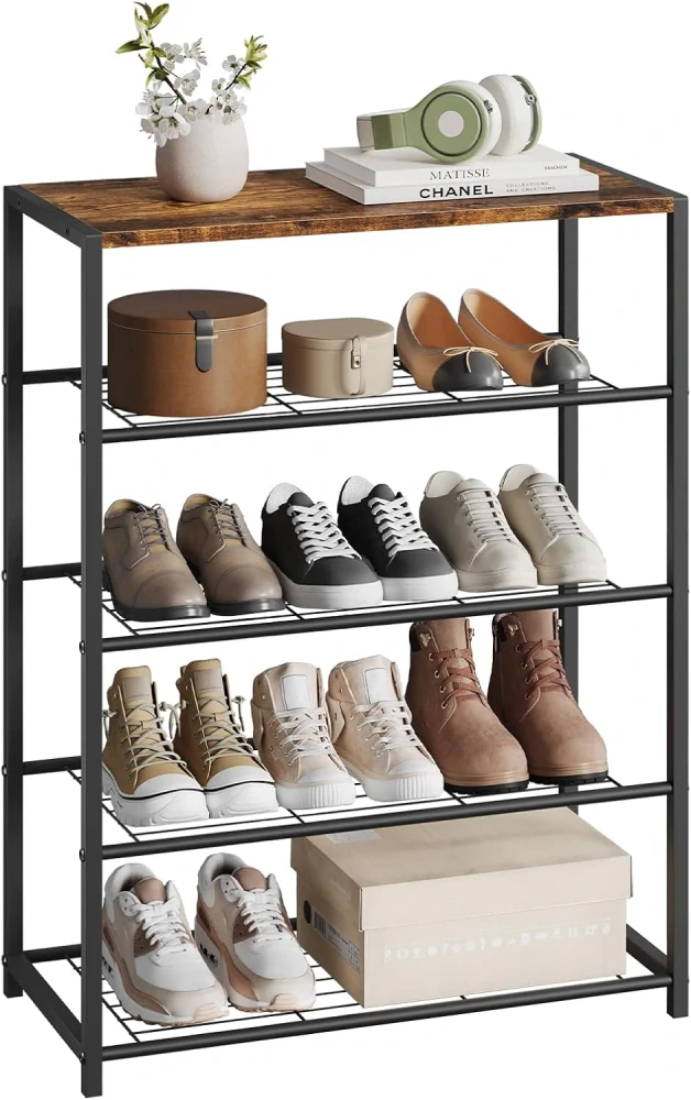 WOLTU Botník, 4patrová botní lavice se sedákem, stojící, kovová, dřevěná, úložná skříňka na boty, organizér do chodby SR0088dc