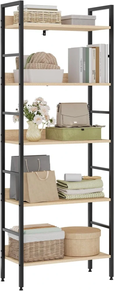 WOLTU RGB9303she Stojan na knihy, vysoká police, knihovna, kovová police, botník, koupelnová police, květinové schody, vyrobeno ze dřeva a oceli, s 5 policemi, cca 60 x 27,5 x 160 cm, černá + světlý dub