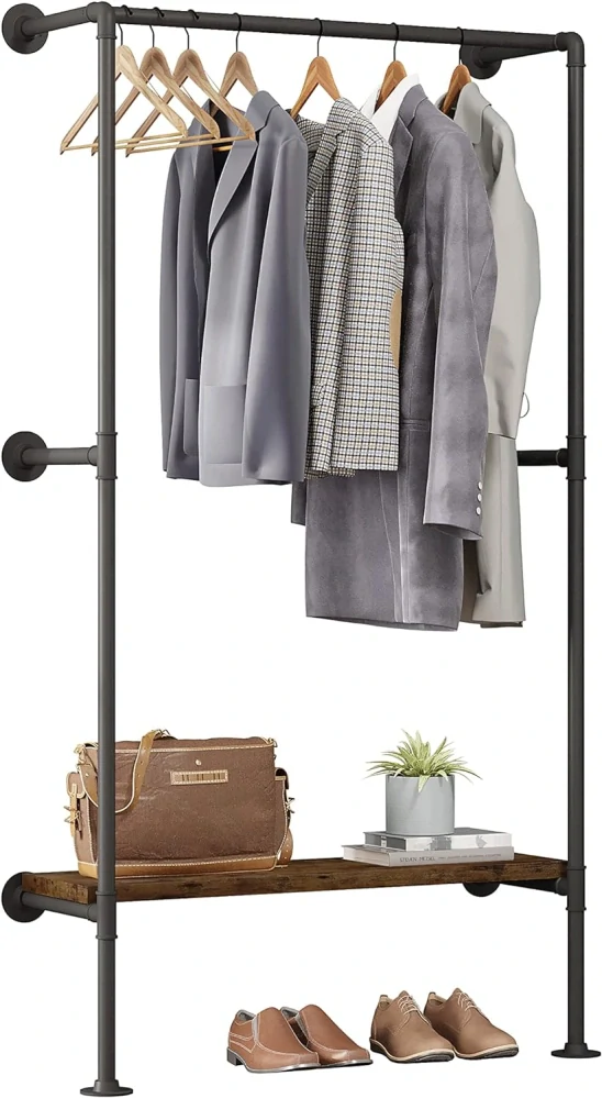 WOLTU šatní tyč průmyslová černá, věšák na oblečení pro montáž na stěnu, věšák na kabáty s policí, do ložnice, systém šatních tyčí vyrobený z kovových trubek MDF